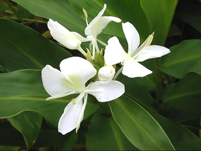 Flor Mariposa: Flor exótica de colores blancas, amarillas o salmón, muy perfumadas. Es la flor nacional de Cuba, donde se ha naturalizado en los sitios húmedos de las serranías. La planta se conoce como ornamental, sin embargo en varias partes del mundo se exploran sus potenciales usos en la medicina, tratamiento residuales y otros. Su delicada fragancia y la belleza de sus flores la hacen muy apreciada para el jardín.