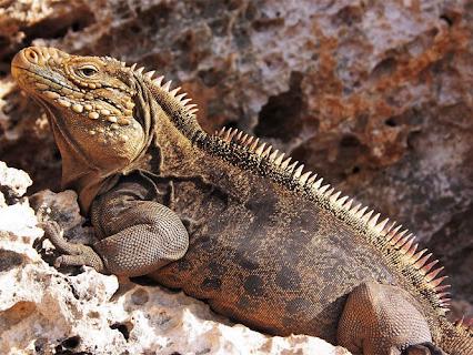 Iguana cubana: Este reptil, endémico de Cuba, habita en lugares pedregosos, próximos a las costas y en los cayos de las provincias centrales del archipiélago cubano, también en los manglares donde tiene una variada dieta herbívora e incluso insectos y otros alimentos de origen animal. Nada y bucea muy bien, lo que le ha permitido distribuirse por casi todas las zonas costeras de la isla, generalmente aisladas y despobladas. Es una especie amenazada de extinción